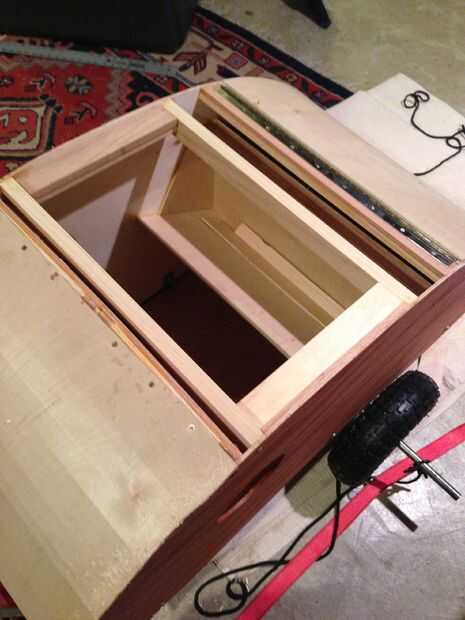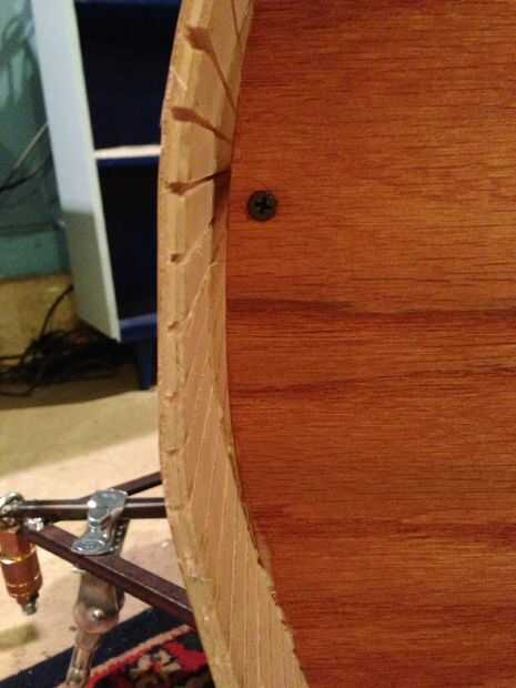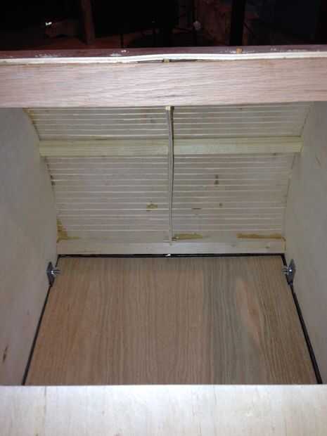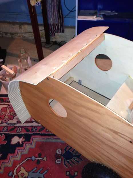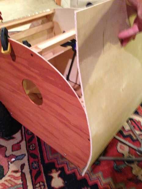 En este punto me había cepillado algunos pegamento para madera en la parte inferior del marco y atornillar la parte inferior del larguero frontal inferior. Yo entonces había cepillado cuidadosamente pegamento a lo largo de los bordes de los lados y la costilla de centro, así como el larguero superior, doblar la hoja de corte-corte alrededor de las curvas, con abrazadera y atornillado a la parte superior en un par de lugar para asegurarlo en su lugar. Mientras estaba en el lugar que podría alcanzar dentro de cepillo un poco de pegamento en las esquinas más asegurarla.