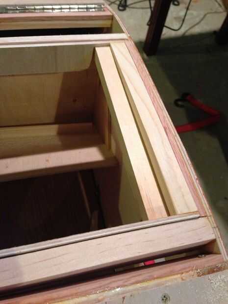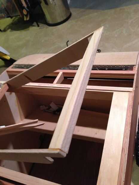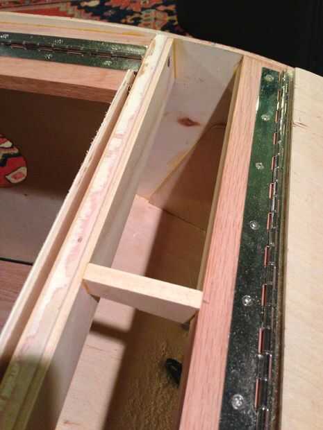 Hice los brazos laterales de la tapa de la misma manera que hice la escotilla trasera. Recuerde colocar los brazos un poco más altos que la madera circundante para que la cubierta de la portilla es capaz de hacer contacto con él cuando se encole en su lugar. La diferencia principal entre la escotilla superior y la tapa trasera, es que termina la escotilla debe ser curvo para que coincida con la curva del borde superior de los lados. Las fotos cuarta y quinta muestran cómo tuve que curva la parte superior del extremo de la escotilla para dar cabida a esa curva. En el extremo de la bisagra también coloqué una pieza curvada para que coincida con la curva de la parte. Puede parecer incómodo, pero es necesario mantener la curva continua del perfil del trailer.