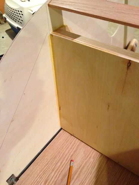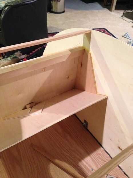 En la segunda foto se puede ver que cortar emparejando piezas angulares de madera contrachapada para pegar el divisor vertical y paneles laterales que actuarán como una herramienta de posicionamiento para la instalación de la plataforma inclinada en el compartimiento delantero. Luego pegué en el panel del estante. La plataforma agrega mucha fuerza e integridad a toda la unidad. Por cierto, ese corto redondo piezas de espiga se pega en el centro de la plataforma para la fuerza agregada. Sé que realmente no tiene mucho sentido, pero lo hice de todos modos, así que hay. En estas fotos puedes ver varios consejos a toda fuerza. La Junta directamente sobre el panel divisorio es roble y es apoyar la bisagra de la escotilla trasera. Utilicé tornillos y pegamento para montar estos tableros de soporte como estos elementos tendrá que tomar un montón de abuso. La Junta bisagra roble posicionar un poco hacia abajo desde el borde de los paneles laterales para permitir que el espesor de las aletas de la bisagra, ya que serán cubiertos por las hojas de panel externo. Puede ver esto en la parte superior de la tercera foto.