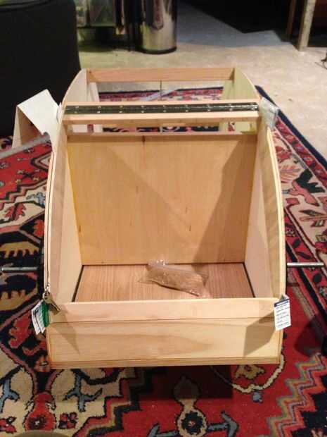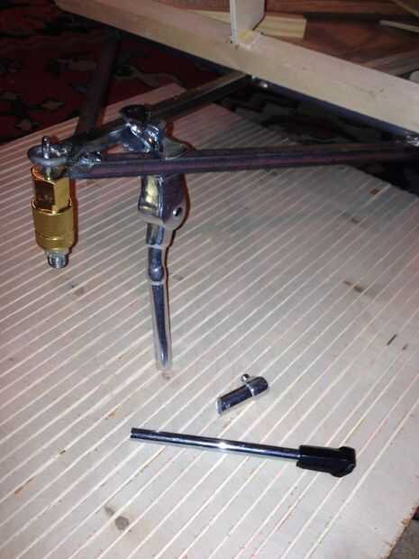 Fue en ese momento que sentí que sería útil tener el extremo frontal apoyado mejor para hacer más fácil el resto de la construcción. Fui a Pep Boys (usted puede encontrar kick está parado apenas sobre dondequiera allí es un departamento de accesorios de bicicleta) y una pata de cabra que podía cortar a la longitud después de determinar qué "nivel" sería para el remolque cuando está bajado.