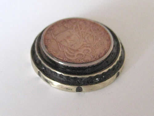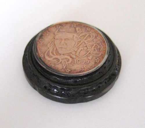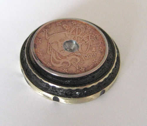 Pegar con pegamento (cianoacrilato) (ser muy cuidadosos con pegamento como se pega la piel al instante y permanentemente (se diseñó como un pegamento de tejido). Me gusta porque es rápido (incluso más rápido si utilizas acelerador) pero podría usar resina de epoxy de dos parte especialmente el rápido ajuste de 90 segundo cosas. Asegúrese de que las monedas son concéntricos y todo centrado correctamente.