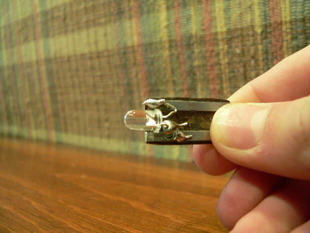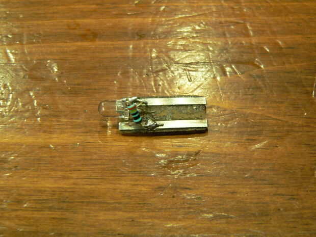 Por lo que ahora finalmente llegar a la soldadura, sí! Tome el LED y mira desde la parte superior, un lado debe ser plano, eso se llama cátodo. Tome el pedazo de masonite que se pegan las tiras de metal a y suelda el ánodo (enfrente de cátodo) del LED a la tira de metal a la izquierda. Ahora tome la resistencia y la curva uno de los conductores que es horizontal y se alinea con la parte inferior de la resistencia, ver segunda foto. El cable horizontal a la derecha tira de la soldadura y suelda el otro cable de la resistencia al cátodo del LED. Usted debe hacer!