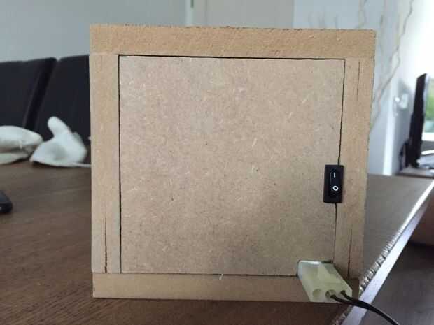 Esta parte tiene que caber en la caja como el ventilador, exactamente 12 cm por 12 cm. Esto puede hacerse con la sierra ciruclar otra vez.