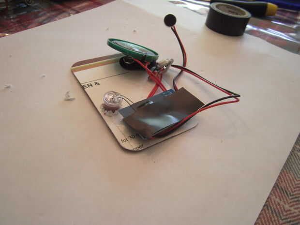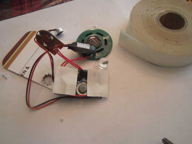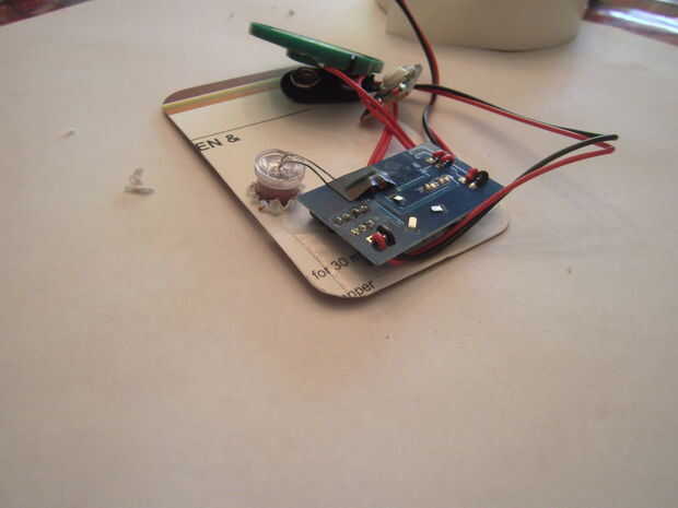 Ahora añadir un trozo de cinta de elecctrical a la parte posterior de la placa de circuito como se muestra en el cuadro 3. Esto protegerá a la Junta Directiva de cortocircuitos en la lata de metal cuando se instala.