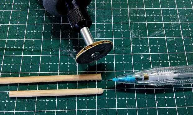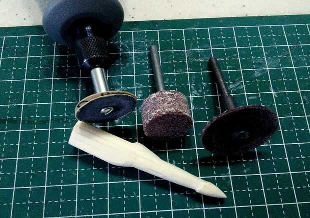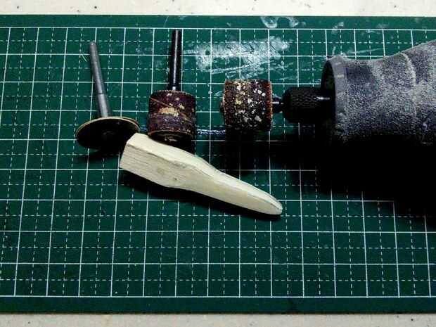 con un accesorio de lijadora de disco fino en un Dremel MiniMite. La nariz y la forma hexagonal del fuselaje fue acabada con un óxido de aluminio #8193 accesorio piedra de pulir.