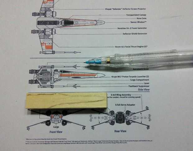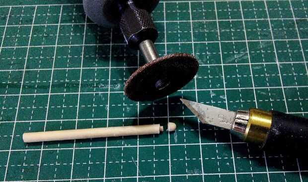 El droide fue cortado de un taco pequeño formado en el extremo con un accesorio de la lijadora de disco. Para evitar que la espiga de la división (una característica desagradable de piezas de madera...), corte la punta justo a medio camino con un disco abrasivo estándar y luego cortarlo completamente con un cuchillo Olfa. El droide fue pegado justo detrás de la cabina del piloto.