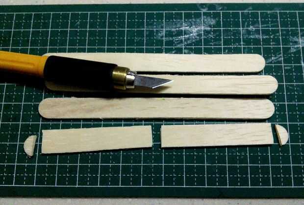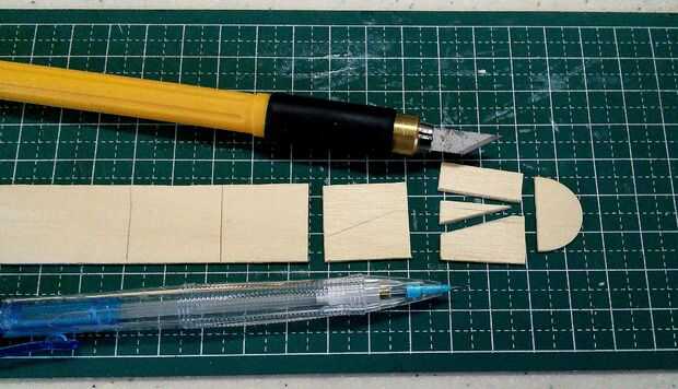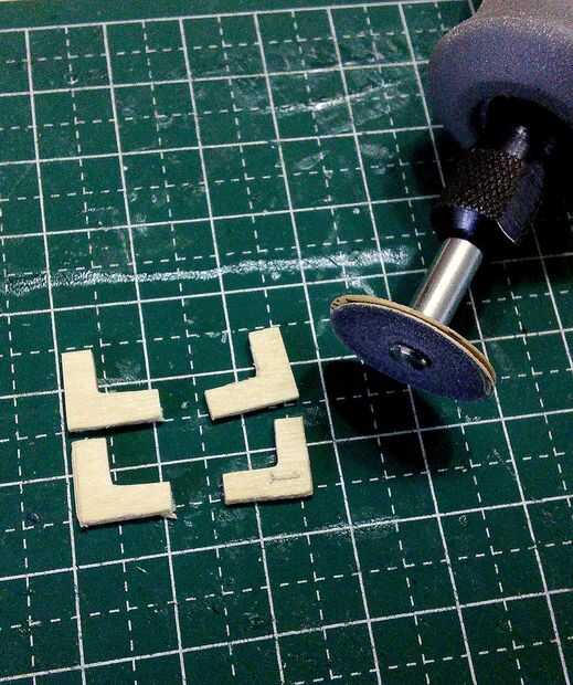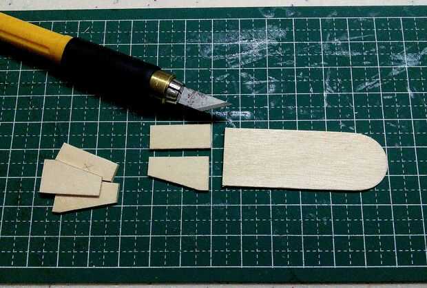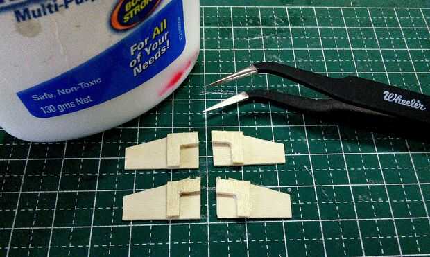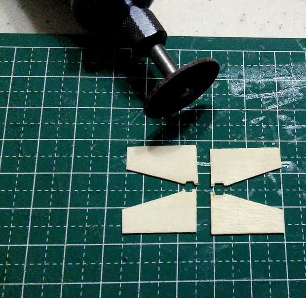 Las alas de 4 cuatro fueron cortadas de un solo palito depresor de lengüeta de tamaño en forma con los esquemas como guía. Se hizo una muesca en el extremo posterior utilizando un accesorio de la rueda de corte estándar en un MiniMite.