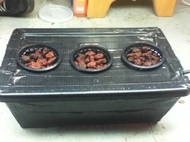Se trata de una bañera Rubbermaid de 1 galón de Walmart que he cubierto en una doble capa de cinta negra para hacerla resistente a la luz. El resto de los materiales son tres 3" net macetas, una bolsa de piedras de lava y negro plástico 1/4" manguera de la local jardín centro/hidropónica almacenar alrededor de $12 y el codo T accesorios, piedras de aire y bomba de aire, también de Walmart. Total compra de Walmart fue aproximadamente de $20.