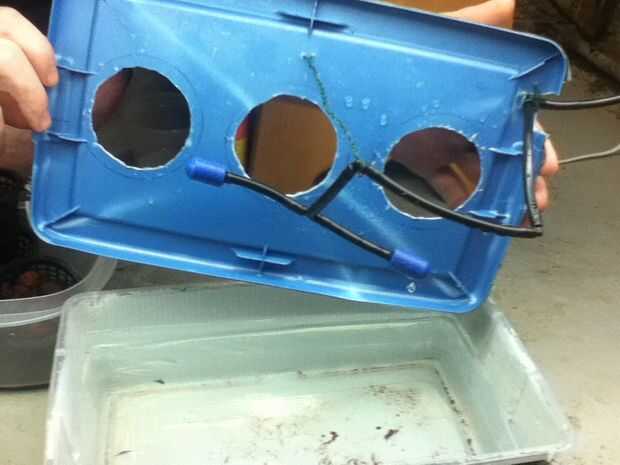 Dos piedras de aire de acuario, algunos codo y accesorios T, 1/4" manguera de riego/aire y una bomba de aire acuario pequeño, manipulado en su lugar con un alambre trenzado para mantenerlo centrado en la parte inferior de la tina.