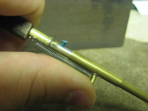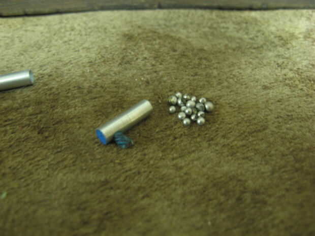 Los explosivos utilizados en los cartuchos están hechos de polvo rojo en casquillos de pistola (clorato de potasio). Solo 4 caps fueron utilizados por bala, y probablemente voy a reducir a 3 porque el arma está mostrando signos de daño.