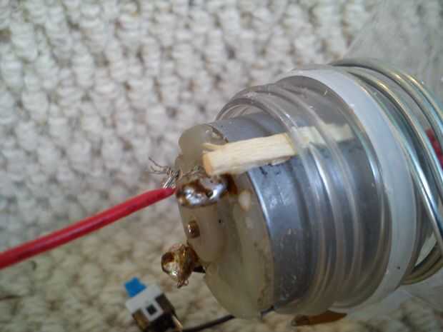 Para hacer el 'cabezal', empuje el motor a través del cuello de la botella y si no encaja perfectamente, usar virutas de un partido como cuñas, pero tenga cuidado de no dañar el motor.