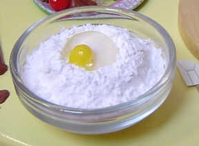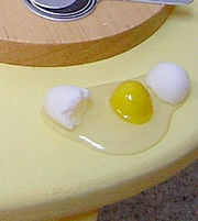 A continuación, quitar la envoltura de la Magdalena mini y coloque en el recipiente de vidrio. Vierta una pequeña cantidad de azúcar en polvo sobre ella. Hacer un pozo en el azúcar en polvo. Añadir unas gotas de jarabe de maíz en el pozo de las claras de huevo. Introducir una mitad de la haba de jalea de Piña Colada para la yema de huevo. Repita el proceso del huevo el huevo roto agregar una haba de jalea de coco a la mitad de las cáscaras. 3 lugar coco gelatina granos enteros cerca para huevos.