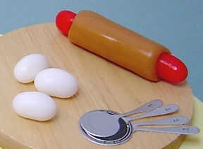 Opcional: Mostrar la escena para hornear en una mesa de la cocina de casa de muñecas tamaño y añadir pegatinas cocina estilo scrapbook para completar el look. He utilizado dos, una espátula de goma y tazas de medir.