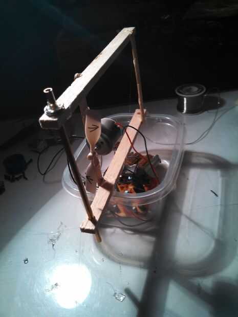Para construir el marco, puede utilizar lo que quieras. Aunque va explicando mi marco. Usé dos piezas largas de madera de balsa y puso uno en la bañera y había pegado abajo. El otro fue conectado cerca 3 pulgadas arriba de la otra via un palito (las fotos explican mejor). A continuación, adjunto otro palito entre las piezas horizontales de madera hacia el final y había pegado el motor principal para. Mis piezas de madera ya tenían agujeros en el extremo que hizo conveniente para poder colocar el tubo de cobre. Sólo pegué una lavadora a un extremo del cobre por lo que sería permanecer en la madera, pero siendo capaz de girar. Una vez que el tubo fue unido, pegué el eje del motor da vuelta a la parte superior del tubo. Hice esto por pegar un palito horizontal de la pieza superior de la madera y luego conectar el motor a como se muestra en las fotos. Después de eso, me corte un rectángulo pequeño de cartulina y había pegado al cobre. Este es el timón.