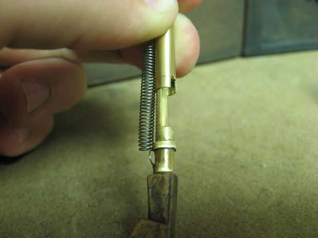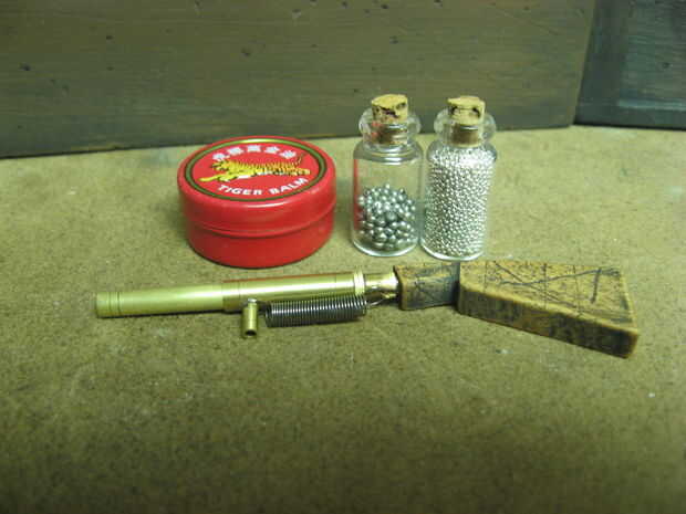Este rifle está hecho enteramente de latón y soldadura excepto la manija, que está hecha de madera. Dispara balas muy pequeños que tienen un poco de energía (ver el video...) y es fácil de recargar.