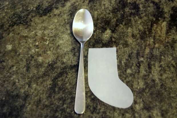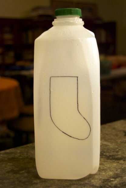 Dibujar su diseño de media en la botella de plástico y recórtalo. Este es de 3-3/4 de punta a los pies y 1-1/2" ancho. El tamaño se basa en ser capaz de pegar un par de dedos dentro para recuperar la sorpresa. No dude en modificar para adaptarse a sus preferencias.