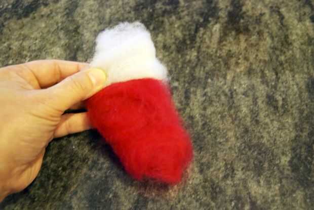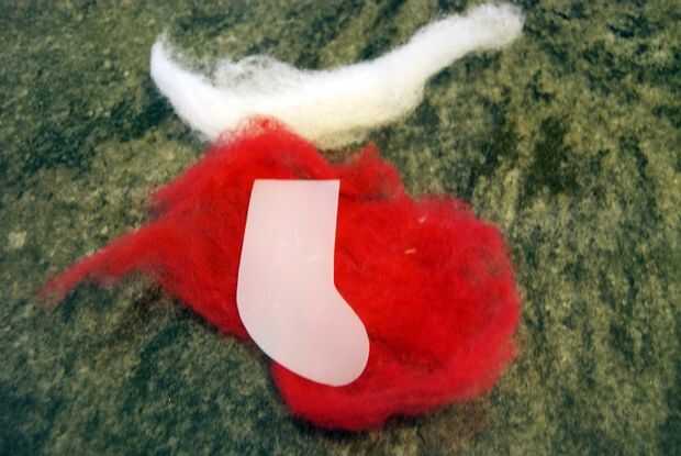 Pone una pieza de lana lo suficientemente grande para envolver el patrón de plástico. Se pueden combinar colores, como en este ejemplo utilizando el rojo para el cuerpo de la blanco para el pun ¢ o y media.