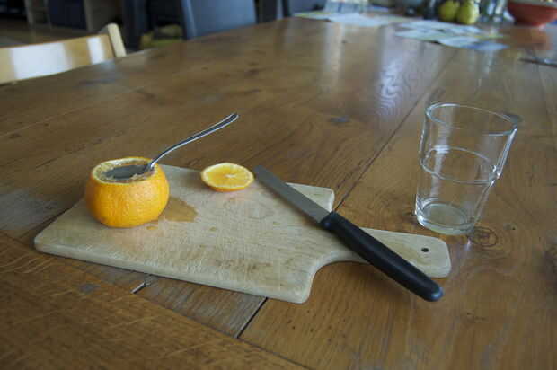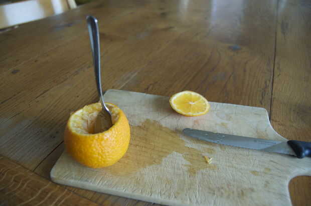 Utilizar el reverso de la cuchara para exprimir algunas del jugo en el vaso, cuidando que no entre en los ojos.