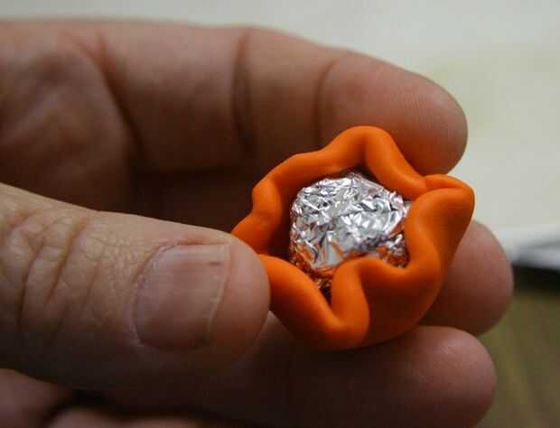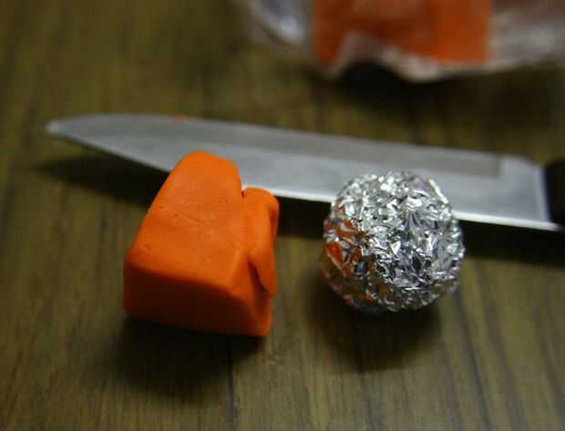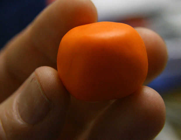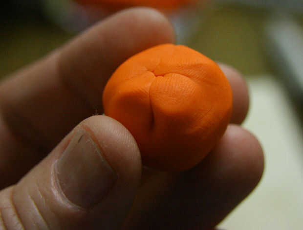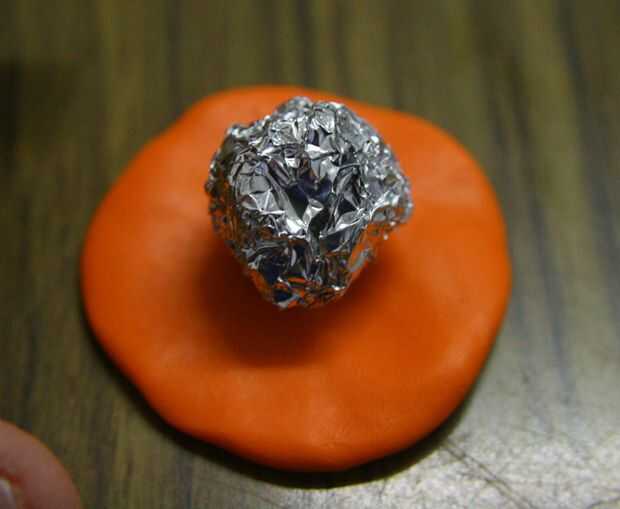 Cortar un trozo de arcilla poli naranja más o menos el tamaño de la bola de papel o un poco más grande. Amasar la arcilla para condicionan. Una vez realizable, rodar en una bola y luego aplanar a un disco de unos 4,5 cm a través.