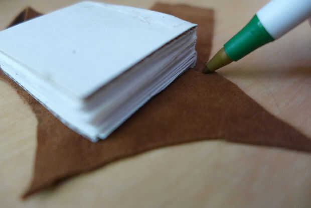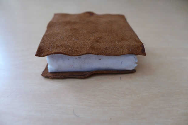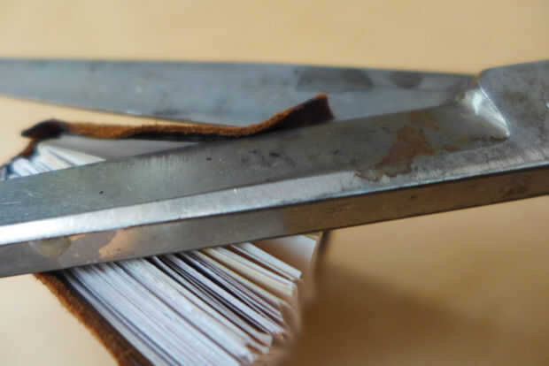 Traza el libro dos veces en la pieza de cuero, luego corta las piezas. Luego reposar el libro en su columna vertebral y rastrearlo y cortar el cuero.