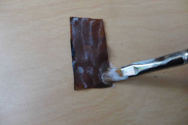 Nota: Dependiendo de su cola demasiado pegamento aplicado a la piel podría remojar aunque y decolorar la piel. Tan sólo poner una capa delgada en.