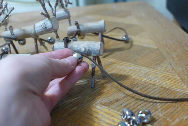 Pegamento en las campanas a intervalos regulares en el arnés. Hice ocho campanas por lado que es dieciséis campanas en todos.