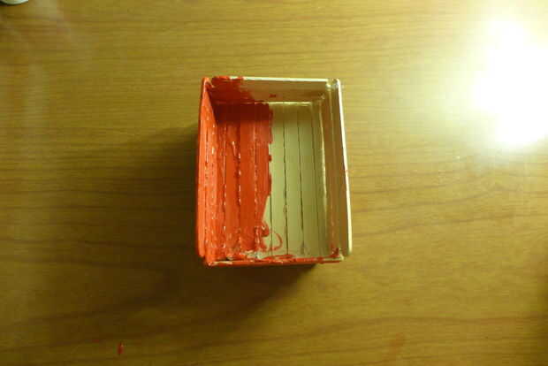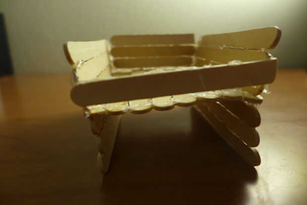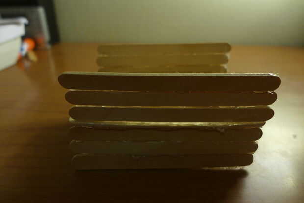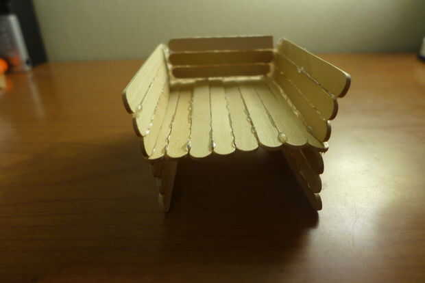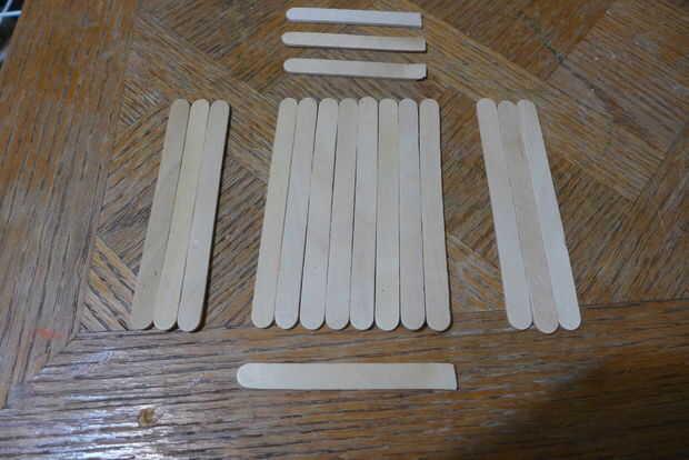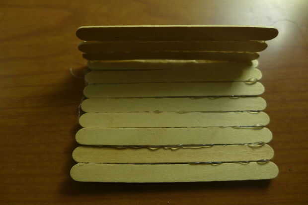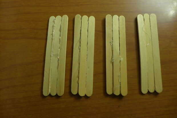 El piso del trineo se hace de ocho palitos pegados juntos. Puede utilizar pegamento caliente o pegamento para madera para esto.