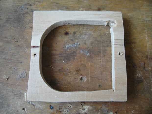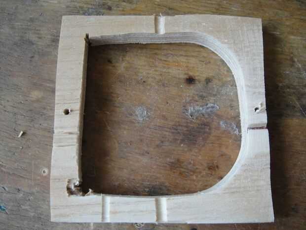 La base está hecha de dos piezas de contrachapado de 12mm. La pieza de la parte inferior tiene un recorte para la electrónica. Ambas piezas son 100mm cuadrado. Hice el corte de la pieza inferior 1cm desde el borde de todo alrededor, la forma exacta y el tamaño no importa. Cuando se ha cortado la pieza de fondo necesita perforar dos agujeros en cada lado así que usted puede atornillar las dos piezas. También necesita tallar tres ranuras para USB y los cables del motor. Usé a un veiner 6mm para esto.