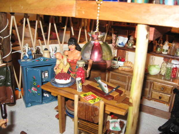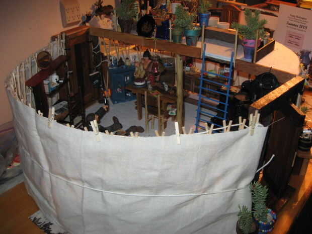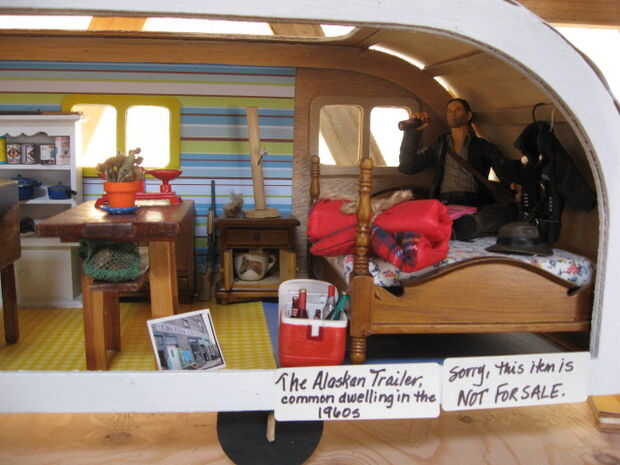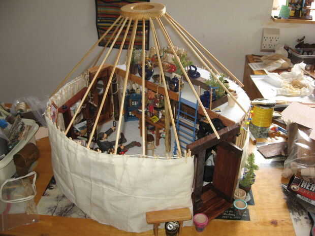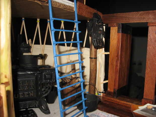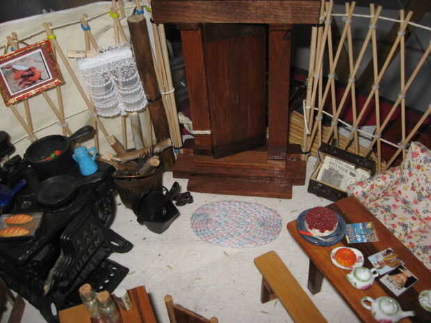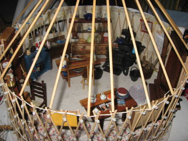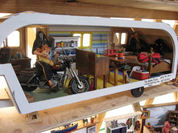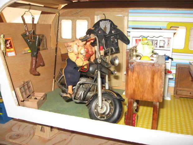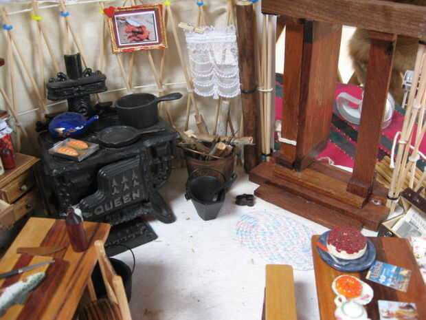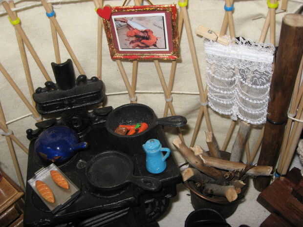 Para una comparación espacial y habitabilidad agregué una pulgada 16 1:12 escala norteamericanos y un 22 pulgadas 1:12 escala acoplado del recorrido a la pantalla de mi mini. La escena de basura de Trailer de Alaska fue un gran éxito con los locales, uno de los cuales nos había prestado su replica de Harley para la temporada. Es divertido ver cómo incluso crecido los hombres reaccionan a miniaturas y estoy reorgainizing mi casa gertee para tener el espacio para mantener el proyecto que durante todo el invierno. Aún no he terminado el tipi.