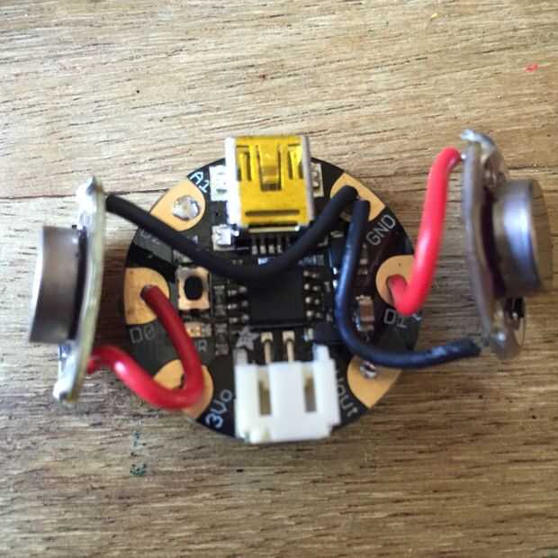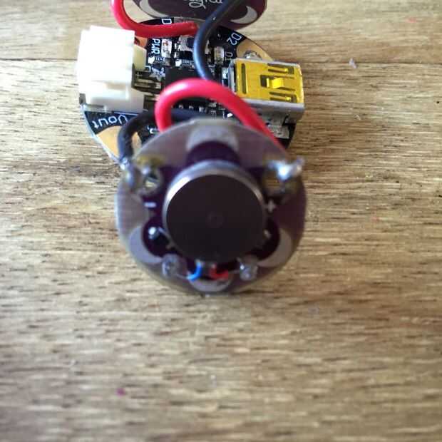 Soldar las terminales "+" del motor al pin D0 de Gemma, y la terminal "-" y GND. Hacer igual con el segundo motor pero el terminal "+" al pin D1 del gemma, y la tierra también al GND. En la figura se observa como van conectados. No dejar suficiente cable, pero exagerar, para poder luego acomodar bien los motores