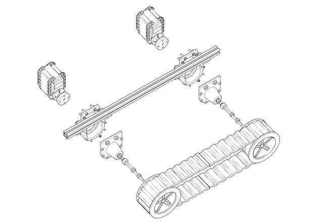La conexión entre las ruedas, chasis y motores es sencilla usando un cojinete para dar soporte al eje de rueda conectado tuercas autoblocante. La estabilidad del eje depende del tamaño y la distancia entre el conjunto de cojinete. Esta solución crea una plataforma más estable para la impresión de que un sistema de suspensión suave.