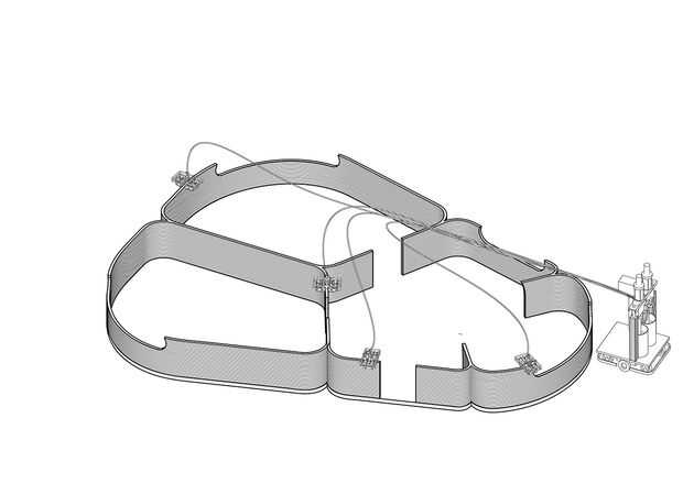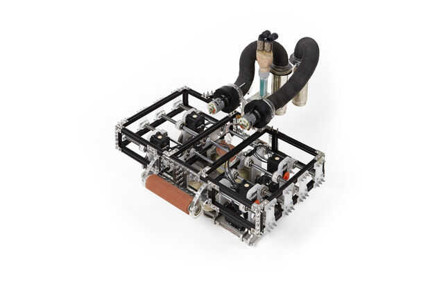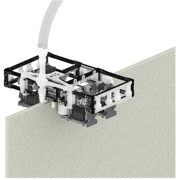 Para crear el shell principal de la estructura final, el segundo robot, el Robot agarre, se adhiere a la huella de la Fundación. Sus cuatro rodillos de la abrazadera en el borde superior de la estructura que le permite moverse a lo largo el material previamente impreso, depositando más capas. La boquilla mueve dinámicamente lo que permite una mayor precisión de la deposición de material. Para crear una superficie curva que del material de salida será compensado de manera incremental. Calentadores, integrados en la estructura del robot aumentan la temperatura del aire local para influir en el proceso de curado. Controlada por software a la medida el robot sigue una ruta predefinida, pero también puede ajustar su ruta para corregir los errores