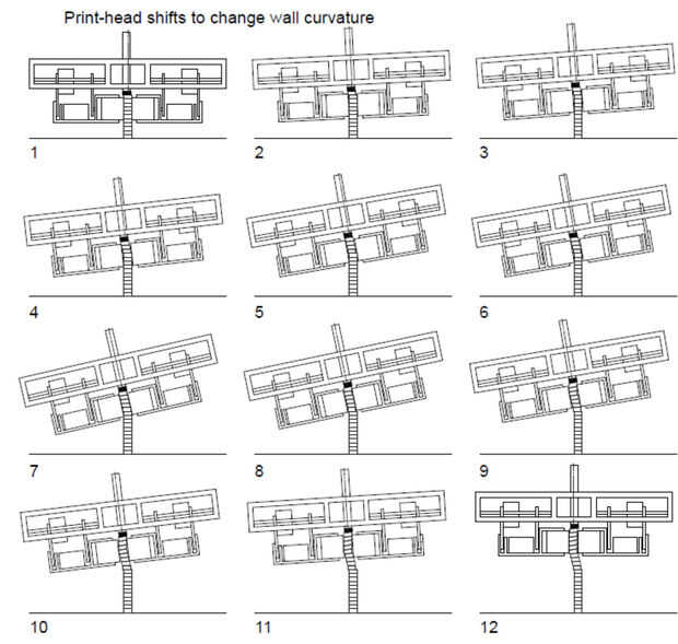 Si el cabezal de impresión se limitó a sólo después de la capa anterior, estructuras impresas sólo podrían ser formadas como sacadas versiones de sus huellas. Esto excluiría a formas como bóvedas y ménsulas. Cambiando el cabezal de impresión proporciona una oportunidad para modificar la curvatura de la pared durante el proceso de impresión. Cuando las capas relativas a sus anteriores capas la curvatura de los cambios de la pared. La cantidad de cambio debe ser calculado de antemano, variando depende de la posición del dispositivo. En caso de que la posición del robot es incorrecta o se detecta un error - desviación de la curva debe tenerse en cuenta y añadir o restar el cambio. La posición del robot en relación con el capas anteriores puede ser abstraída de varias maneras, por ejemplo diferentes tipos de sensores de sistemas de posicionamiento Local para contadores de giro en las ruedas que lleva a muchas posibilidades.