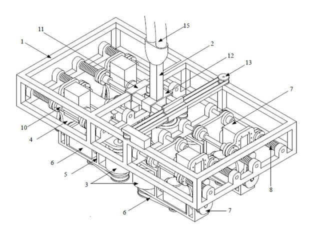 sistema de movimiento lineal lateral (12), traseras, sistema de accionamiento de movimiento (13), sistema de accionamiento de movimiento lateral (14) y actuadores para el cabezal de impresión o múltiples cabezales de impresión. La conexión de los cabezales de impresión para el suministro de material se ilustra en (15). El dispositivo de sistema de posicionamiento consta de pies (5), que cada uno conectado a un más cuatro o más patas (4) que se unen a la estructura. Las piernas están conectadas a la estructura mediante un sistema de movimiento lineal (9). Cojinetes del movimiento linear (10) permiten un desplazamiento suave en relación con el marco. Este movimiento se puede accionar por resortes o por actuadores lineales (8). Pies se unen a las piernas a través de juntas rotativas que permiten una rotación con respecto a las piernas. Esta rotación puede ser controlada y se acciona mediante el sistema de accionamiento de pie (7). Las ruedas (3) están montadas en los pies y se mueven utilizando el sistema de accionamiento de la rueda (6). La superficie está cubierta con un material durable y flexible para reducir la vibración del dispositivo durante el movimiento y aumentar su agarre a la estructura en la que el dispositivo está conectado.
