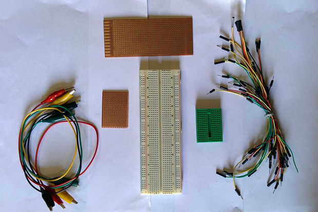 Una plataforma de prototipado muy versátil es la soldadura menos los protoboard. Antes de soldar los componentes en el circuito de prueba con tablero de pan primero. En un tablero braed puede incluso construir circuitos bastante complejos usando circuitos integrados y otros componentes.