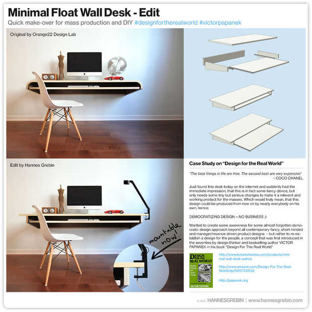 Acabo de encontrar este escritorio hoy en internet y de repente tuvo la sensación inmediata, esto es en realidad un dispositivo de lujo, que sólo necesita algunos cambios pequeños pero graves para que sea un producto relevante y de trabajo para las masas. Que realmente significa, que este diseño podría producirse de ahora en adelante por casi todo el mundo por su cuenta, por lo tanto: