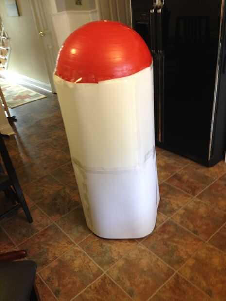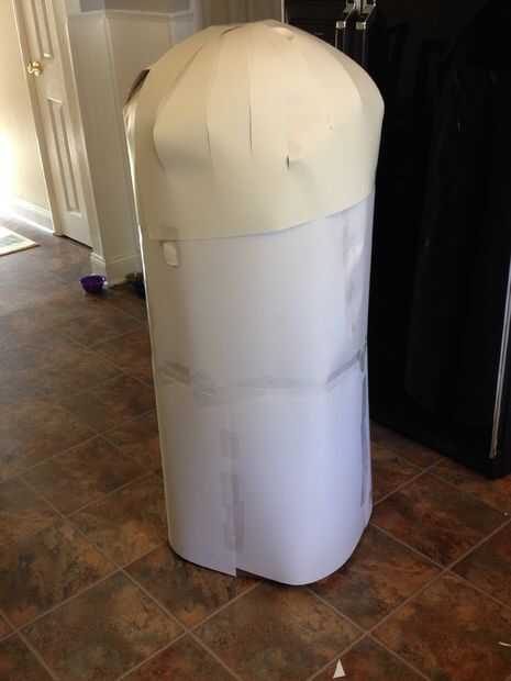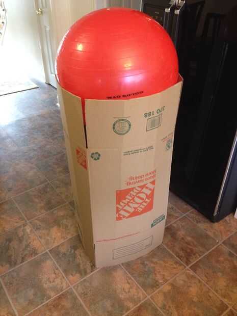 Calculado de la manera más fácil de obtener la forma de la Redondo-tapa de cilindro, estaba una caja de cartón (ya tenido en la mano) y una pelota de ejercicio (ya tenido en la mano) y pop la bola en la caja. Asegúrese de que la cinta de la caja desde el interior-que llegaré más tarde. Entonces tomé algunos cartulina fina y lo envolvió para formar la forma del cilindro. Por último, áspero corté el corte en triángulos para hacerles sentarse algo plana contra la curva superior. Esto no es la manera más profesional, pero lo voy a dar un resultado "bastante cerca".