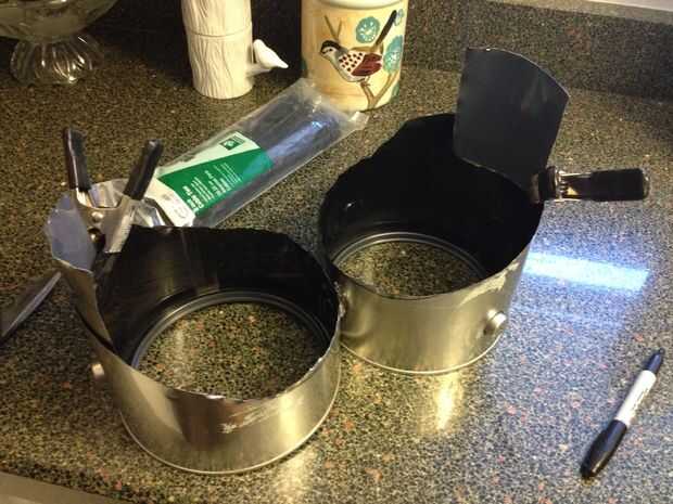 Tomar el galón dos latas de pintura y tratar de dibujar la curva de la forma de cilindro en la parte superior. Utilice tijeras o afilados tijeras o incluso un cuchillo del cortador de la caja para cortar esa misma curva en las latas. Yo en mal estado esto cuatro veces y finalmente decidió "lo suficientemente cerca" era suficientemente bueno. Cinta adhesiva maravillas cuando mantiene todo en su lugar para pegar.