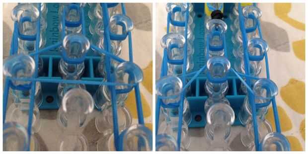 Para la parte inferior del uniforme, colocar una banda de triángulo azul único en las clavijas que se muestra. A continuación, llevar la parte inferior de la misma alrededor de la clavija central, que también se muestra en la imagen.