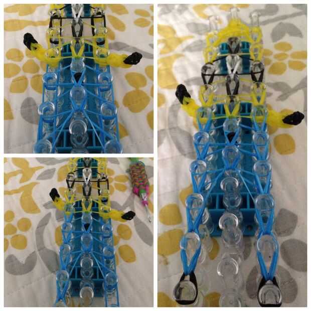 Telar el centro y los lados como normal. Al llegar a los brazos, asegúrese de que vaya dentro de todas las bandas y agarra las bandas inferior dos 2. Tenga cuidado de no agarrar las bandas mal. Si no, su creación entera podría desmoronarse. As long as agarras al menos una de las bandas de derecha, va a estar bien =)