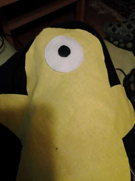 Luego cosí el bolsillo a la parte delantera de los pantalones y el ojo blanco en el cuerpo amarillo.