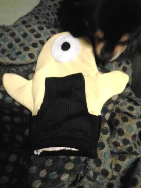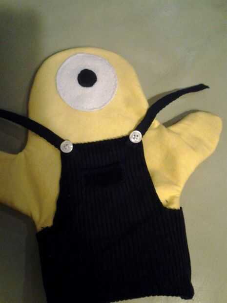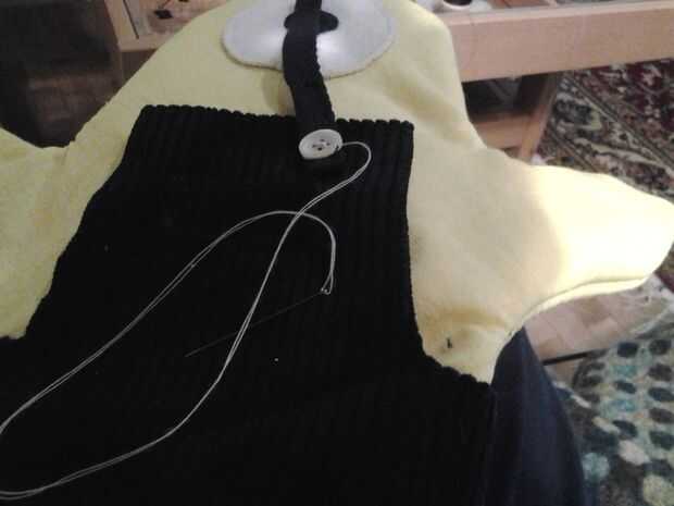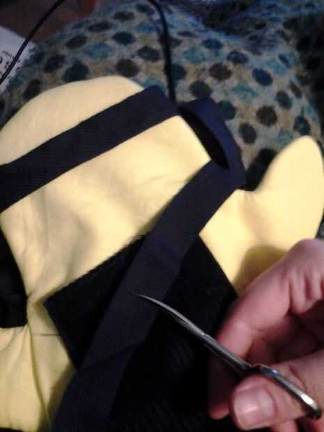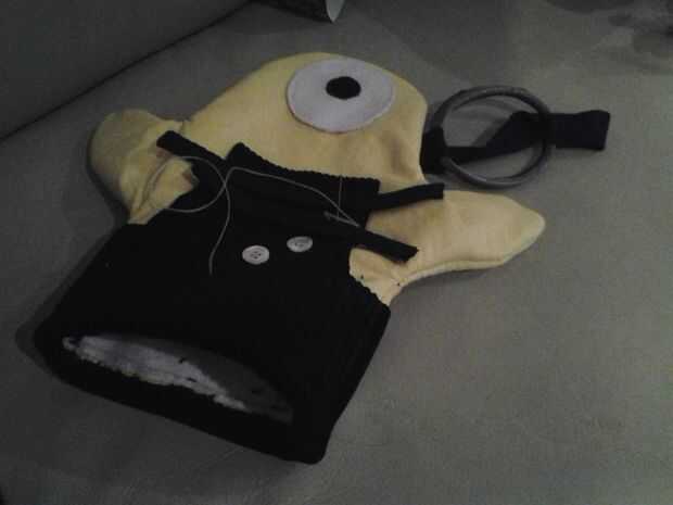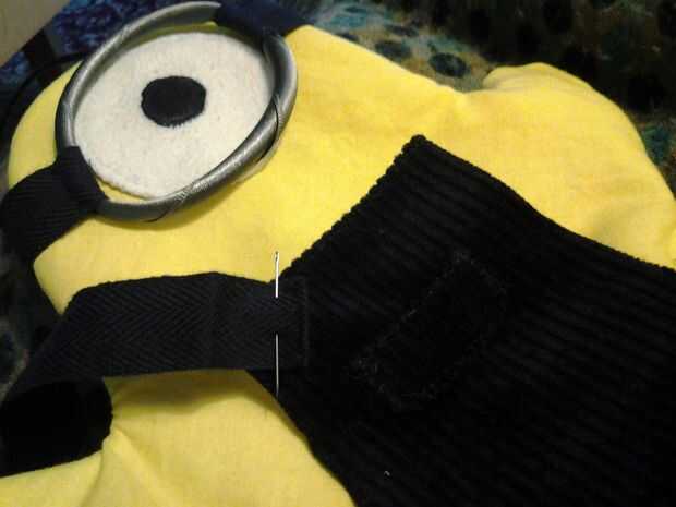 Ahora tire de los extremos sueltos de tirantes a la parte posterior de su guante y coser a los bordes de los pantalones, pero esta vez no en la parte superior, pero escondido detrás de los pantalones.