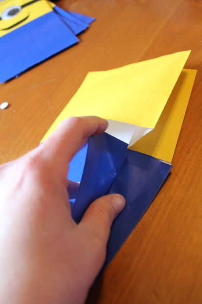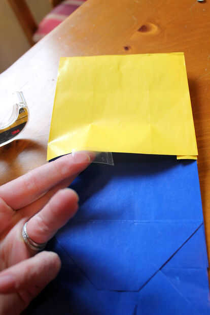 Este paso es probablemente el más complicado de todo el proyecto. Para hacer la cabeza de Minion, usted necesitará obtener la parte superior de la mitad de la bolsa amarilla unida alrededor de la bolsa azul. Encontré que era más fácil hacerlo mientras ambas bolsas todavía estaban cerrados, pero usted querrá asegurarse de que una vez que se abren las bolsas, se alineen correctamente.
