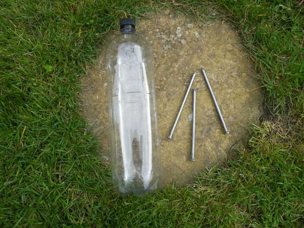 Para hacer los dardos básicos, todo lo que necesitas son botellas de refresco de dos litros, seis pulgadas clavos y algún tipo de pegamento de relleno de espacio (he utilizado pegamento caliente, pero un epoxi de dos partes no así).
