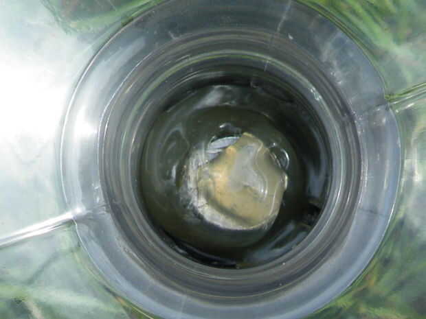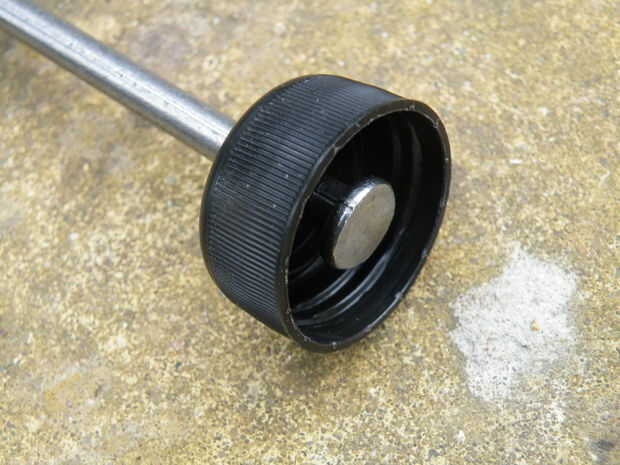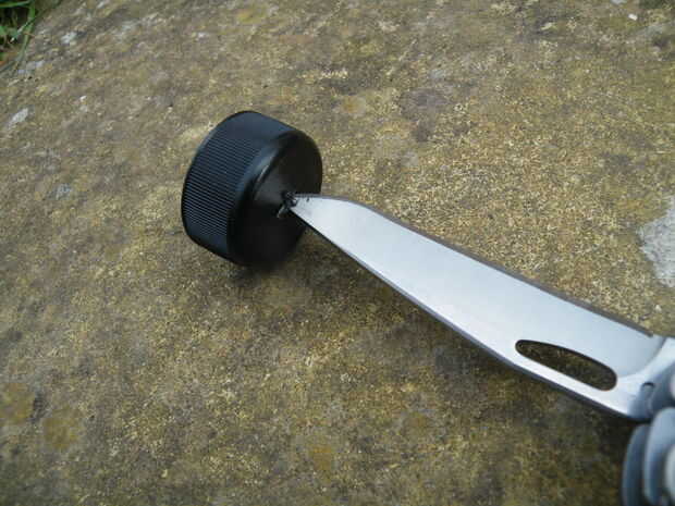 Cuando usted empuja el clavo, no empujarlo a través, dejar cerca de un tercio de pulgada de proyección dentro de la tapa. Llenar la tapa con el pegamento de relleno de espacio y atornille directamente sobre la botella. Cuando se pone el pegamento, sostenga el clavo rígidamente en su lugar.