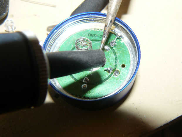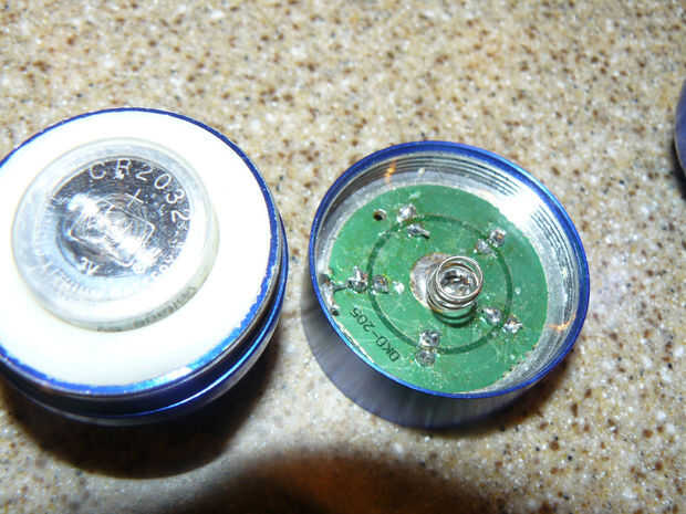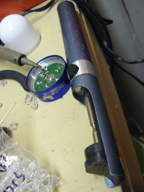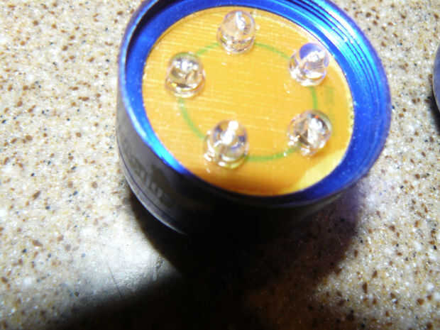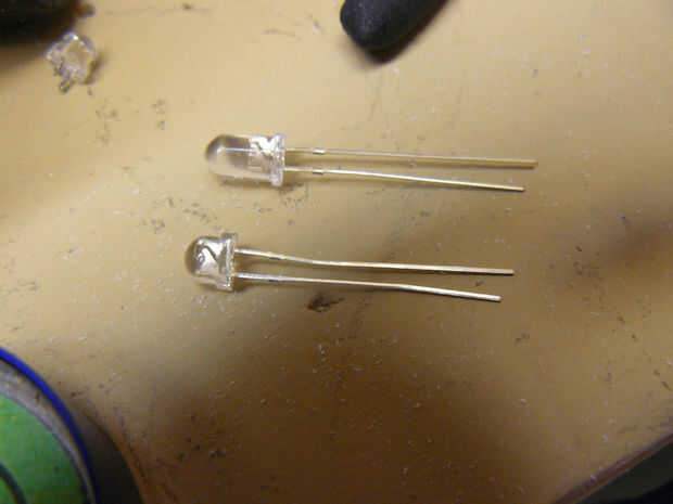 Para abrir la lámpara, desenrosque la pieza de plástico superior y la 2 º pieza. Esto permitirá a usted tener acceso a la placa de circuito que tiene los LEDs. Romper el lechón de la soldadura, calentar el empalme de la soldadura y chupar a la soldadura fundida. Una vez retirado el LED, vuelva a colocar con un ángulo de gran sombrero de paja de 5 m m LED. Al principio se cansó una regular de 5mm LED que tenía puesta alrededor. No era bueno para esta luz como los LEDs son normalmente demasiado concentrado y emitir un punto de luz en el difusor de plástico. El gran angular LED son el camino a seguir. La última foto en esta página muestra el gran angular LED junto a una normal de 5 mm LED que usted creció para arriba con.