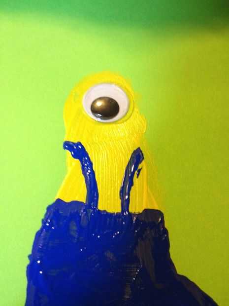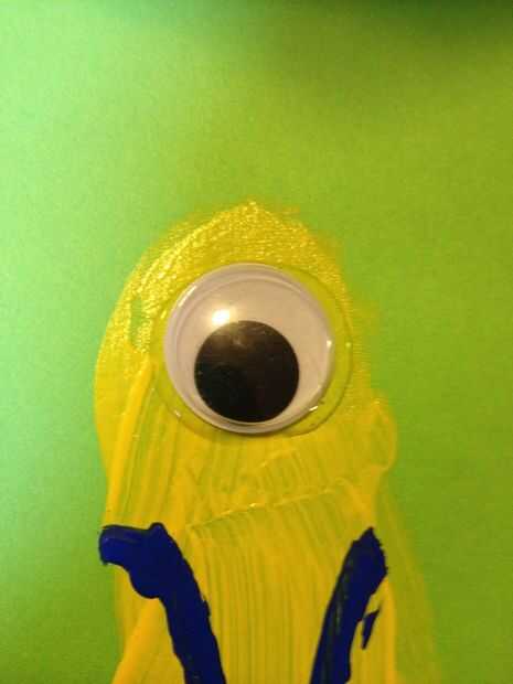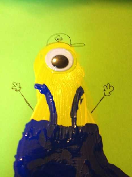 Pegar un ojo de google sobre la cabeza de sus súbditos. No utilice demasiado pegamento, como hice yo. Harán sólo dos pequeños puntos! Deje que se seque antes de ser despreciable y continua en. Oh, también dibuja los brazos y pies, si quieres antes de continuar en el, y mientras esperas para que el ojo seco. Además, no olvidéis el pelo! Eligió un sombrero en su lugar con el logotipo de Gru.