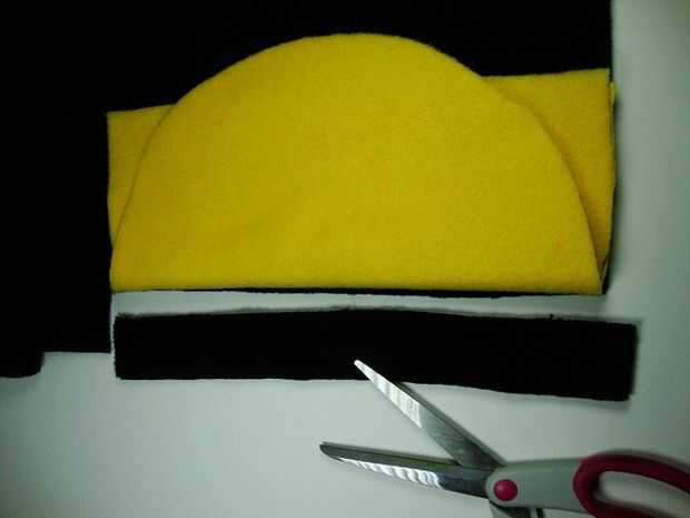 Banda: Se trata de negro. Doblar la parte de sombrero amarillo en la mitad para obtener su longitud. Corte alrededor de 1 pulgada de espesor, sobre el doblez por lo que es una pieza larga. (Quinta foto)