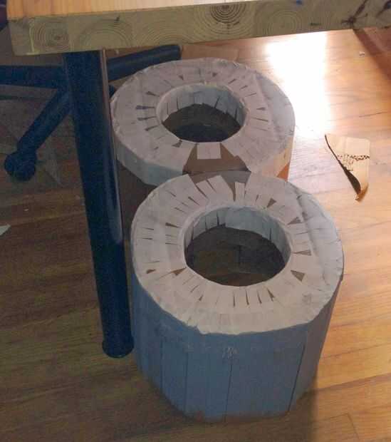 Siguiendo el mismo diseño, anotó la cartulina otra vez sobre cada 2 pulgadas y lo envolvió sobre un círculo.  Esta vez usé un lugar de 7".  Ayudan en lugar temporalmente con cinta adhesiva mientras que caliente pegados juntos. Entonces cubierto con papel de copia normal, como yo quería que tienen un acabado más liso y había pintado gris.