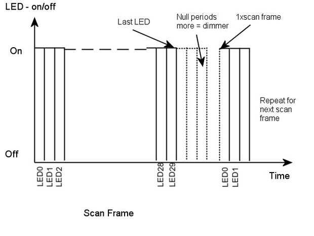 Para realizar una función de regulación, esto se extendió un poco para que después de los 30 LEDs que bien iluminado (o no) entonces períodos extras se gastarían en enviar valores nulos si la pantalla era atenuada... para el brillo completo entonces no se gastarían períodos extras. Cuando repite si había muchos períodos null a los LED iluminados, la pantalla sería débil. En efecto se trata de modulación de anchura de pulso multiplexado... o porque el hardware está configurado en un arreglo de charlieplex, entonces charlieplexed pulso modulación de anchura.